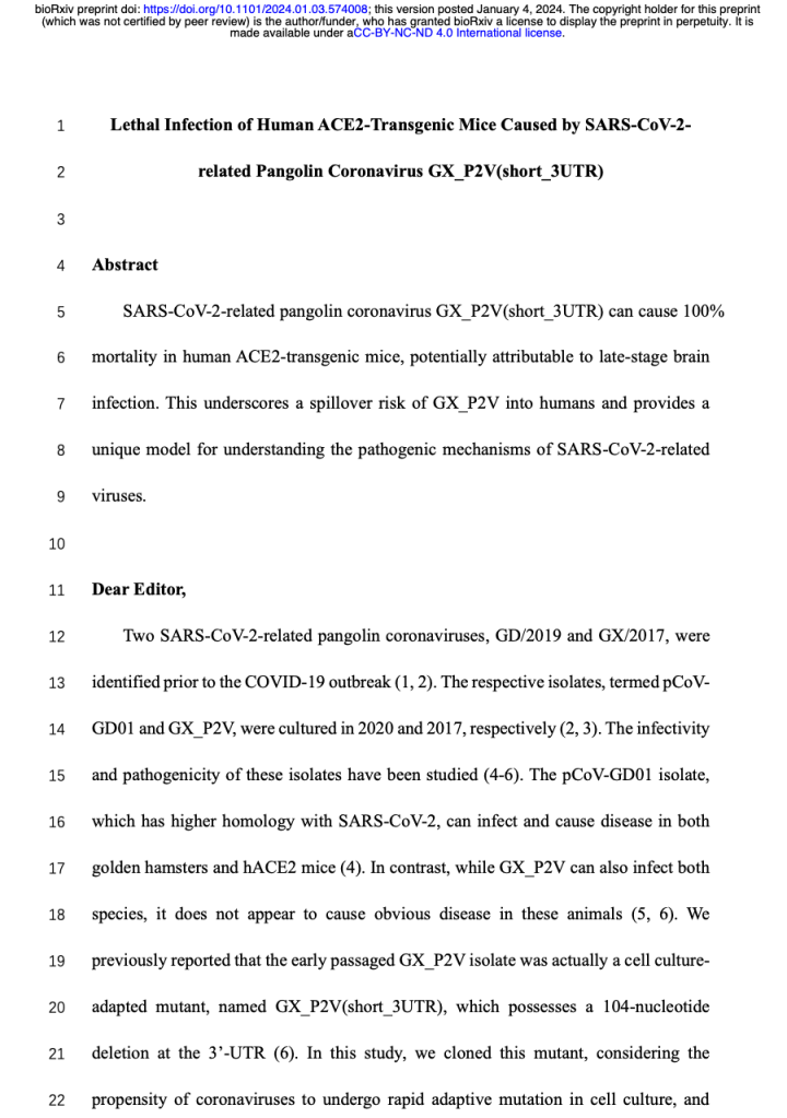 The scientists, including a doctor trained by the Chinese military, cloned a pangolin coronavirus and infected modified mice to “assess its pathogenicity,” they said in a preprint paper published on bioRxiv.